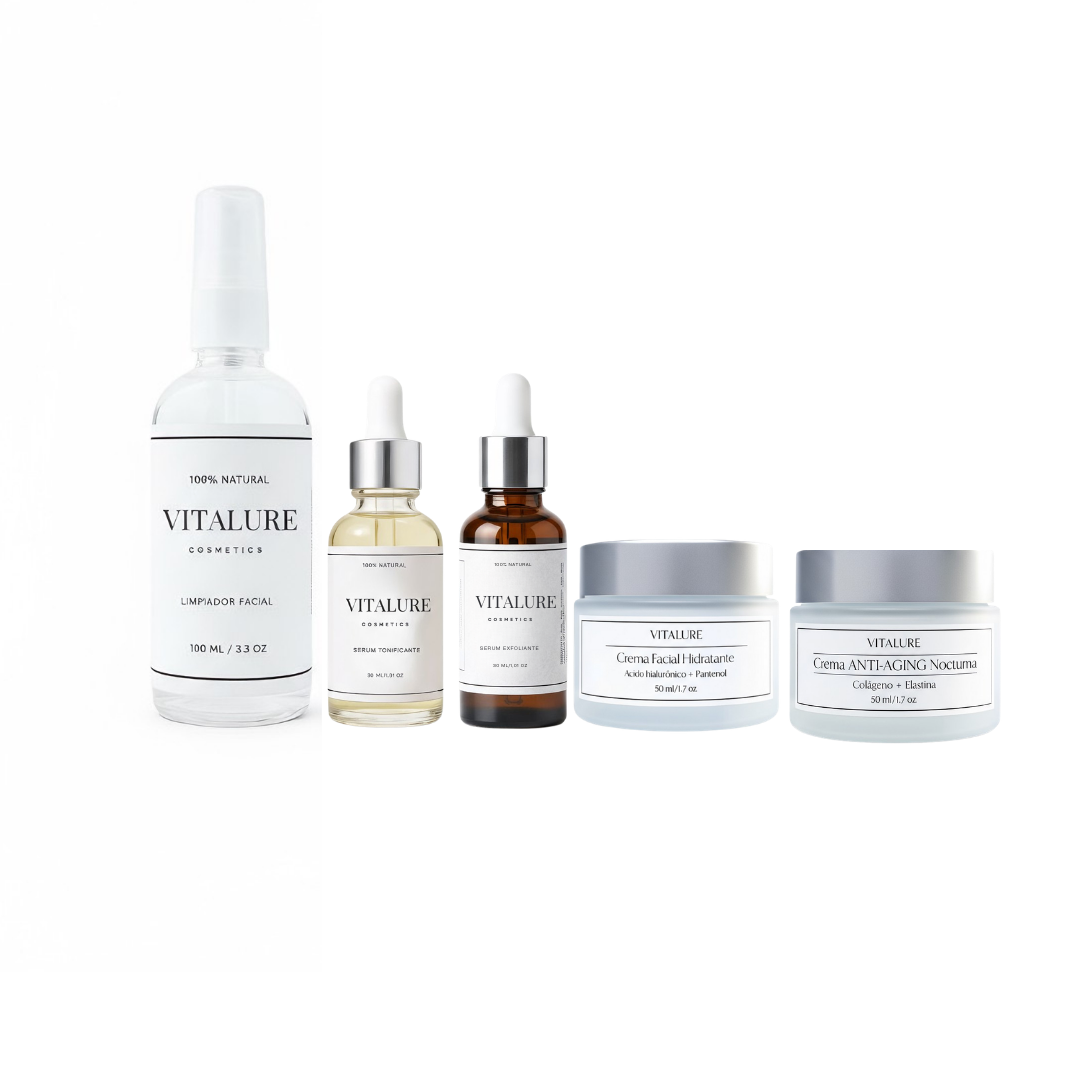 Esta rutina incluye Limpiador Facial + Serum Tonificante + Serum Exfoliante+ Crema hidratante de día + Crema antiage nocturna