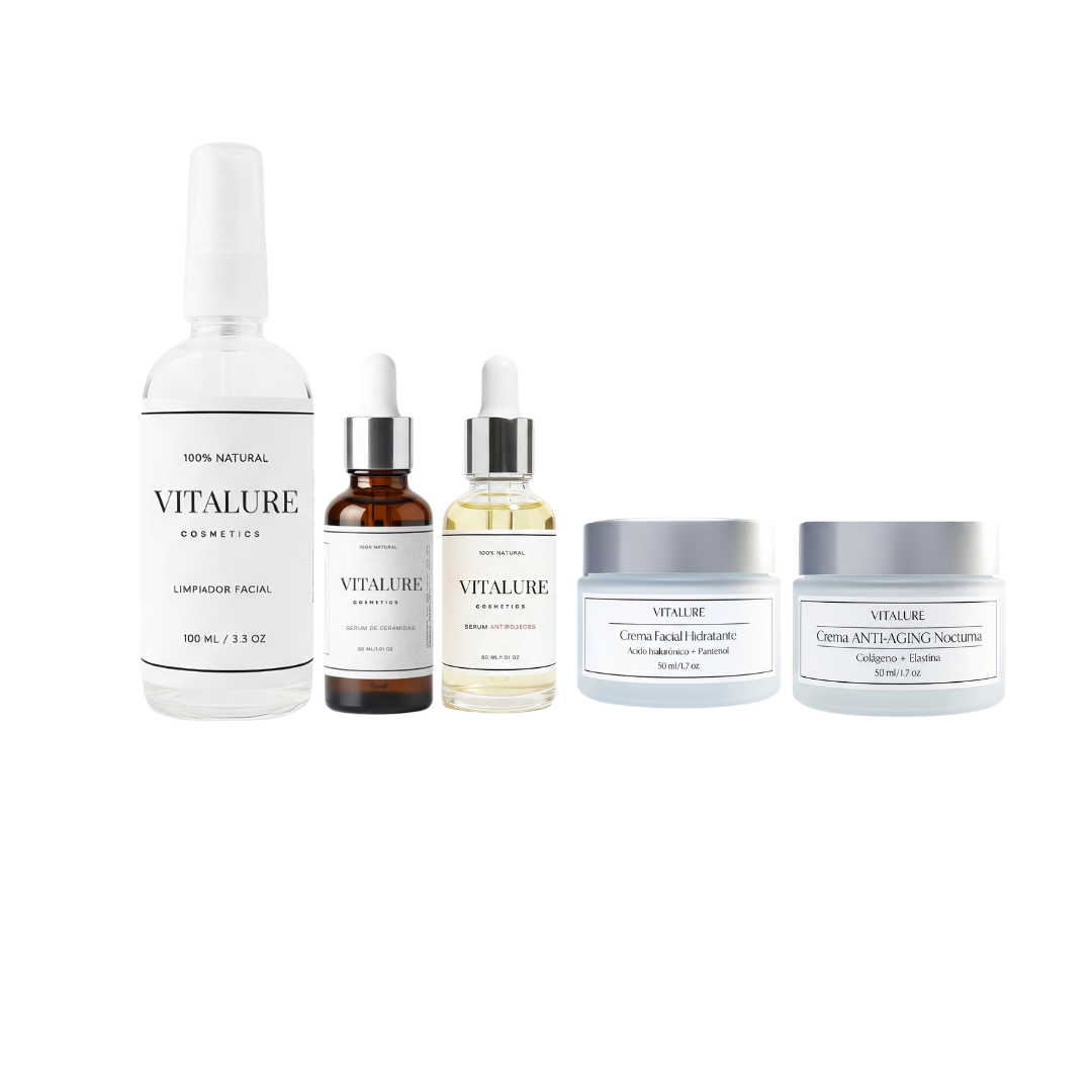 Esta rutina incluye Limpiador Facial + Serum de cerámidas + Serum Antirojeces+ Crema hidratante de día + Crema antiage nocturna